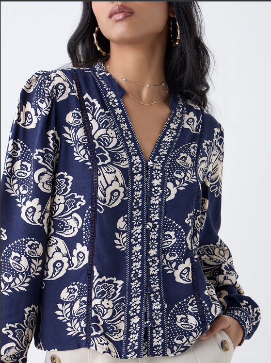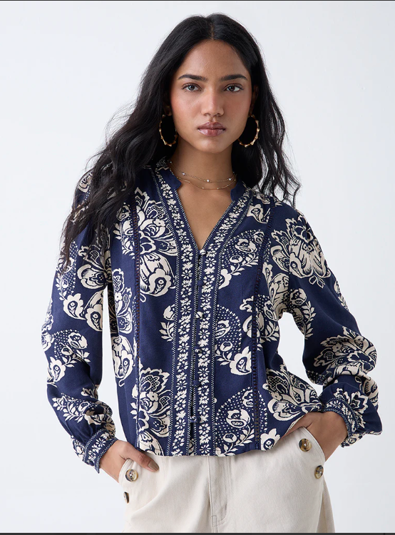 Turn everyday moments into something remarkable with this navy top by LOV. Artful floral prints punctuate the midnight hue, while a mandarin neckline and buttoned placket offer relaxed refinement. Billowy peasant sleeves and an ultra-soft drape make it the piece you’ll reach for when effortless polish is non-negotiable.